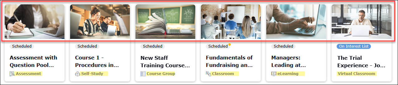 Default Course Images: Default course images have been updated to enhance the user experience by providing a visually appealing and organized course catalog. These default course images help learners quickly identify courses, improve engagement, and ensure a professional and cohesive learning environment. This update should not affect custom images you’ve added to the LMS and are currently using on your courses. This is only related to default system-provided images. The new images for each delivery method are shown below.