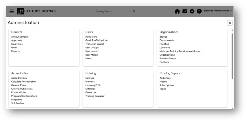 In our upcoming LatitudeLearning release on October 26th, portal administrators will notice a refreshed and more intuitive Administrator Navigation experience. The new layout, still accessed via the gear icon in the LMS header, emphasizes ease of use and organization, offering a cleaner, more logical structure that makes it faster to locate and manage key administrative functions. By grouping related features together, the redesigned navigation helps you move efficiently through your daily portal administration tasks with few extra clicks and confusion.