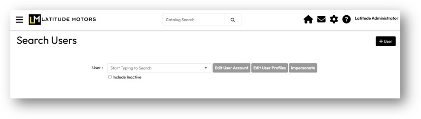 In the example below, selecting Users under the User section now acts as both Search Users and Add Users – the search form is the default view and the +User button at the upper right takes you to Add User form.
