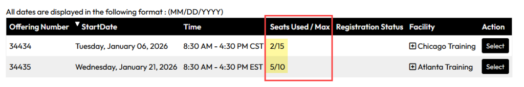Classroom Offerings: When enrolling yourself or others in offerings, the Offering Selection list will now display the number of open seats available compared to the maximum allowed.