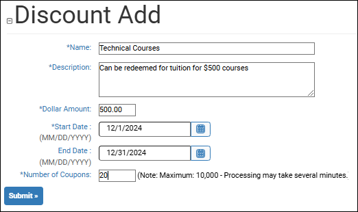 Complete the “Discount Add” form and click Submit when ready. Coupon generation is immediate and you will be automatically rerouted to the “Discount Edit” page.