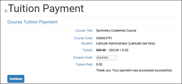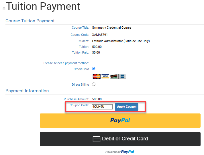 Applying a valid coupon code will reduce the “Purchase Amount” by the total discount amount, and will prompt the enrolling student to provide payment information to cover only the remaining cost, if any. For more information on payment forms, please read related document: Paying Course Tuition in the LMS.