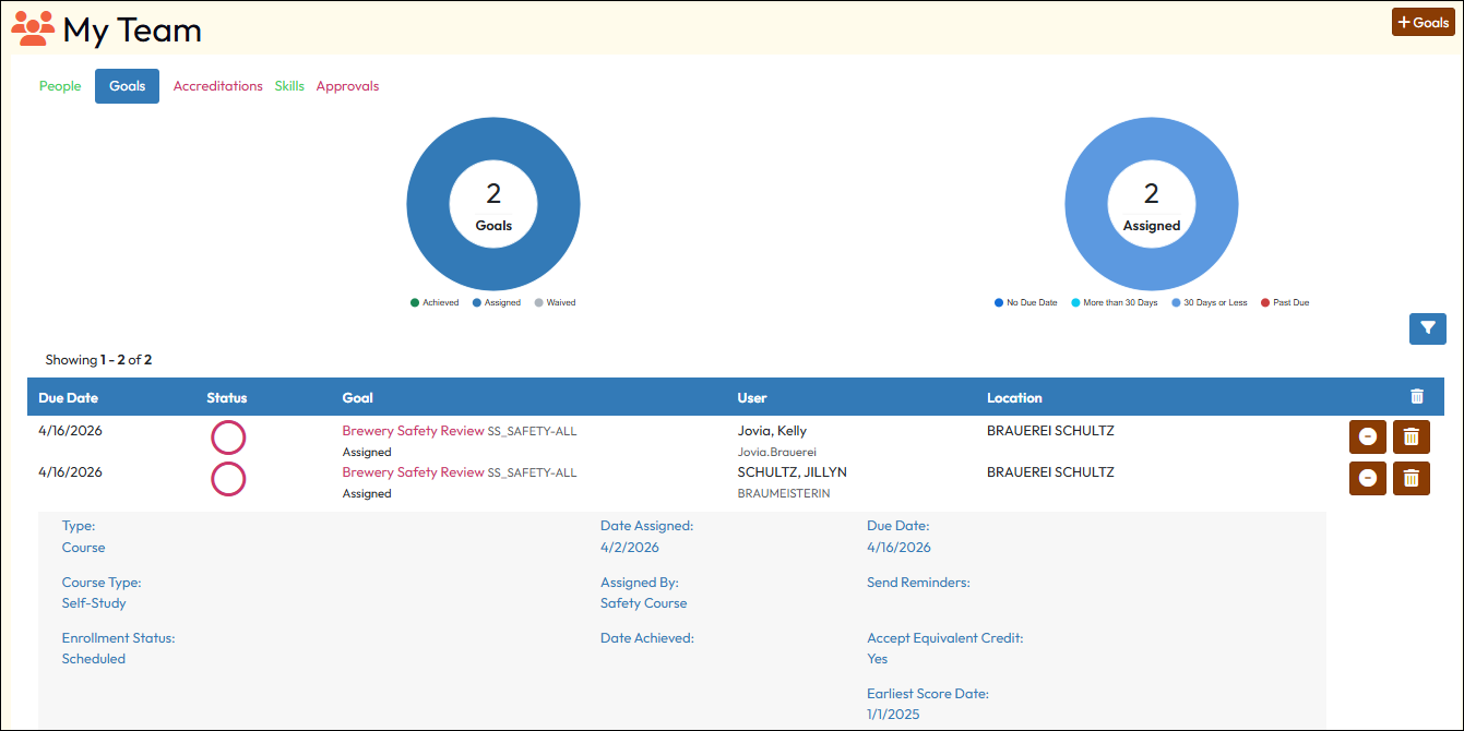 Goals are the only means of assigning accreditations to a learner. While they can achieve an accreditation by meeting all the requirements in a passive manner, a goal rule stands out to them and can be displayed on their My Learning page, Courses to Complete (if configured to do so), and on their My Training Plan page. They can clearly see their requirements and whether they are on track or overdue in accomplishing their goals.