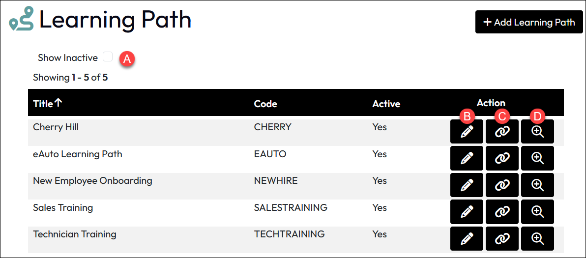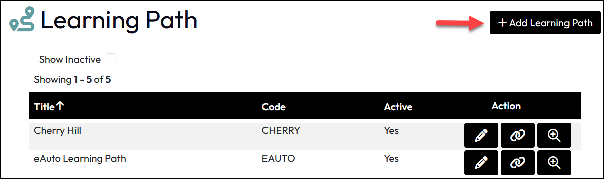 • Show Inactive: Enable to have the Learning Path List include any paths that have previously been inactivated.