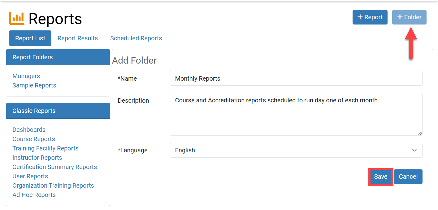 All Portal Administrators in your LMS enjoy full add, edit, copy, and delete rights for all custom reports and folders, even those they did not author. Share reports with other Roles to grant managers the ability to run custom reports, maintain their results repository, and setup a scheduled reports list for automatic execution. Report Folders will only display to users who have access to at least one custom report housed within the folder.