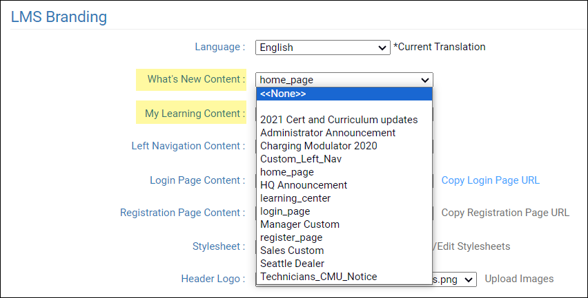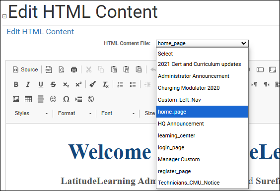 • Select an existing HTML content file from the HTML Content File drop-down list.By default, the What’s New page content is controlled by home_page and the My Learning Page is controlled by You can also update custom versions of these pages already used in your LMS by different organizations or position groups.