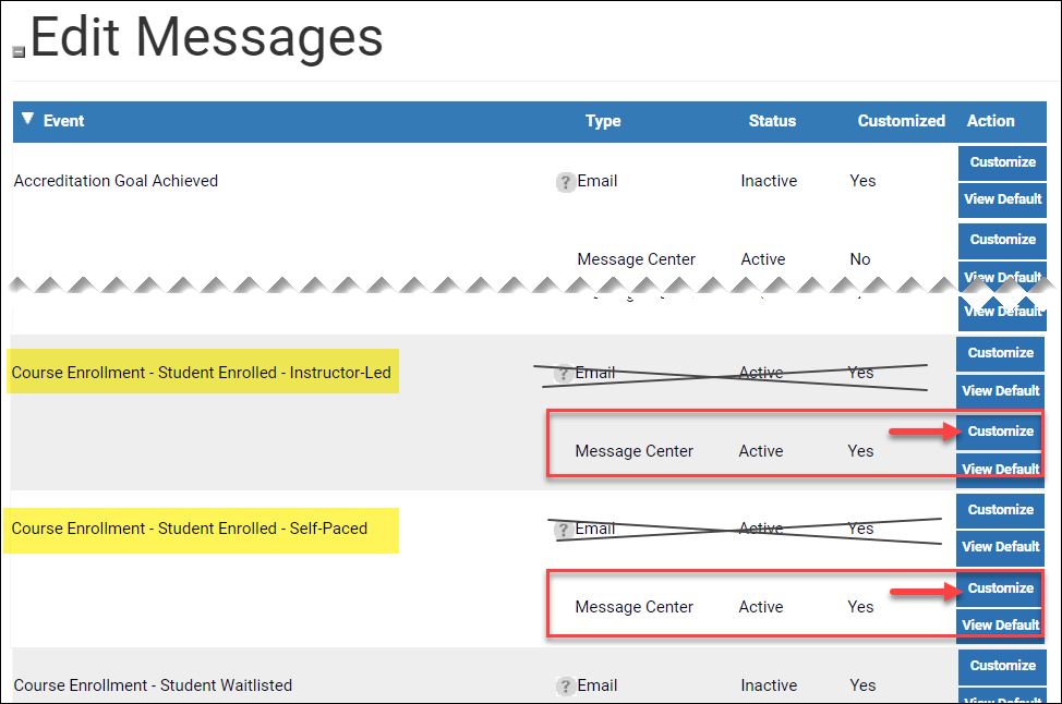 1. From the Administration Menu, navigate to Site Management > Edit Messages and find the Course-related message to which you will add the course link details. This update will only work with the Message Center version of a message, not the Email version.