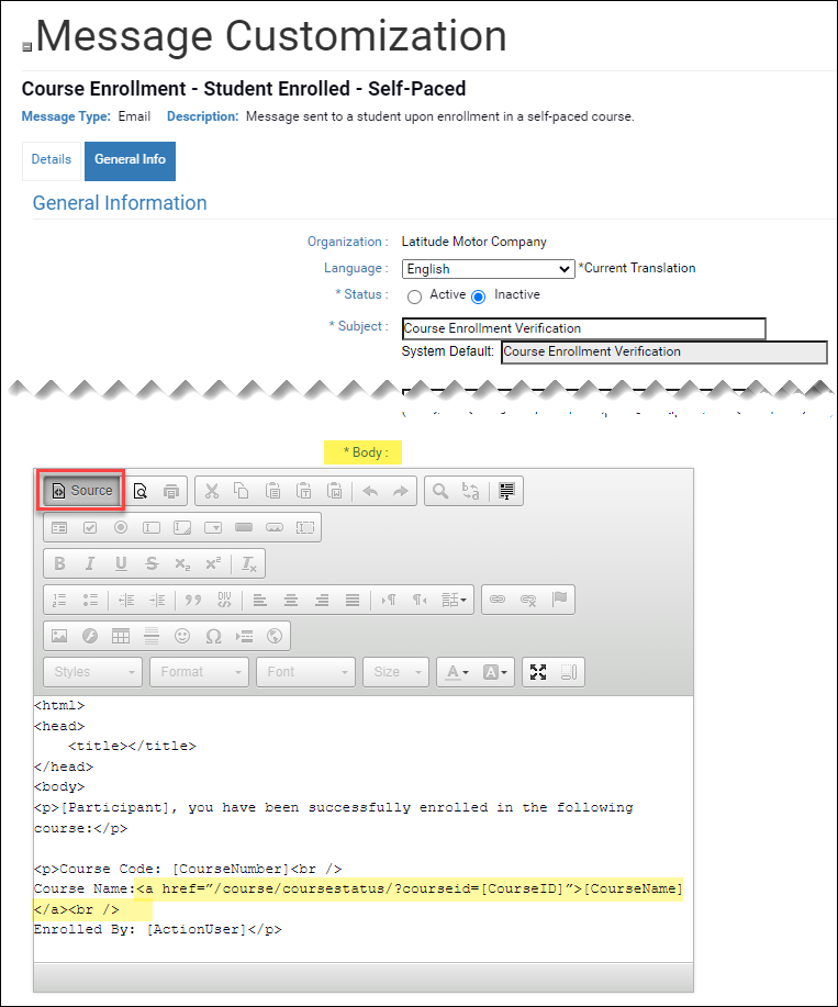 2. On the Message Customization page’s General Information tab, scroll down to the Body content area to view the current message content and variables.