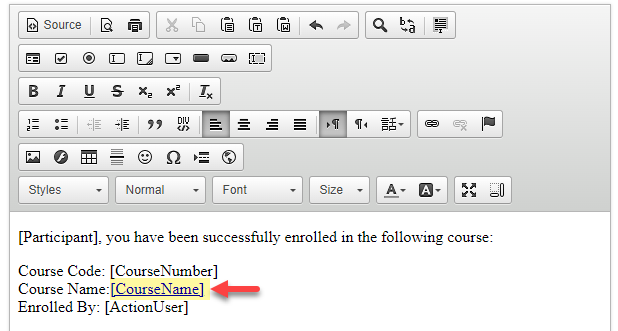 Messages generate based on actions taken for a course (enrollment, cancellation) so the course information on the message needs to be able to change dynamically. Variables like [CourseNumber] and [CourseName] are auto-filled upon delivery based on that specific event.