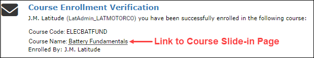 The steps below describe how to add a Course link to Course-related messages sent to a user on the LMS Messages page. Examples of target messages would be Course Enrollment – Student Enrolled – Self-Paced, Course Enrollment – Student Enrolled – Instructor-Led, Course Enrollment – Past Due Date and others using the [CourseName] variable in the message body. The message recipient can then click on the Course link in the message to open the course slide-in page.