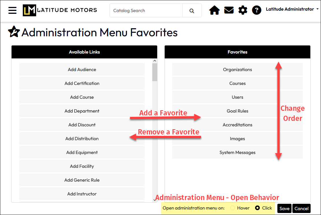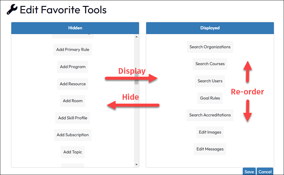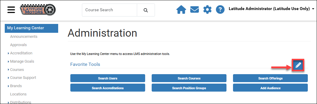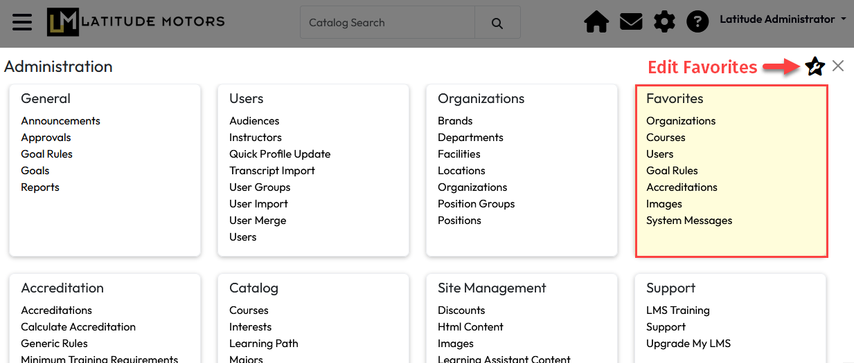 Access to each LMS feature is determined by a user’s highest Role assignment, so users will only be provided Favorite Tool options already visible to them in the main Administration page.