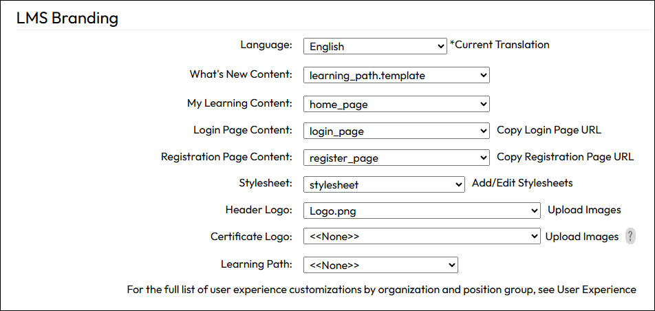 Customize the LMS with branded content, color, and style using HTML, CSS files, and images. Changes made here become the portal default for organizations and position groups unless further customizations are made to brand at the organization or portal group level.