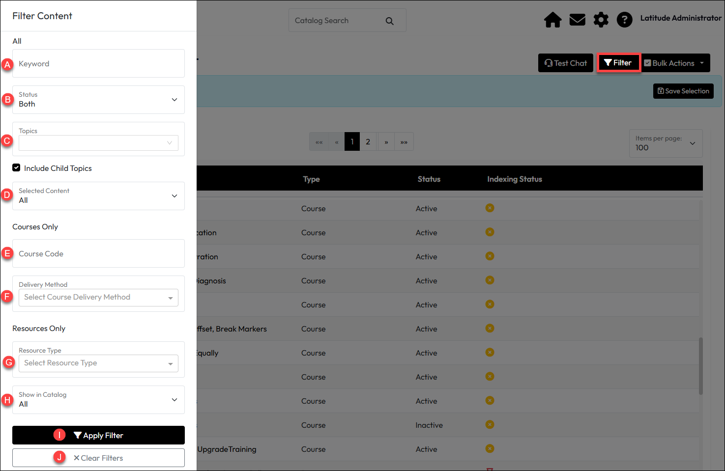You can filter the items in the content list to make it easier to find and take action on the items displayed. They are separated into sections based on whether they filter all items, or specifically courses or resources.