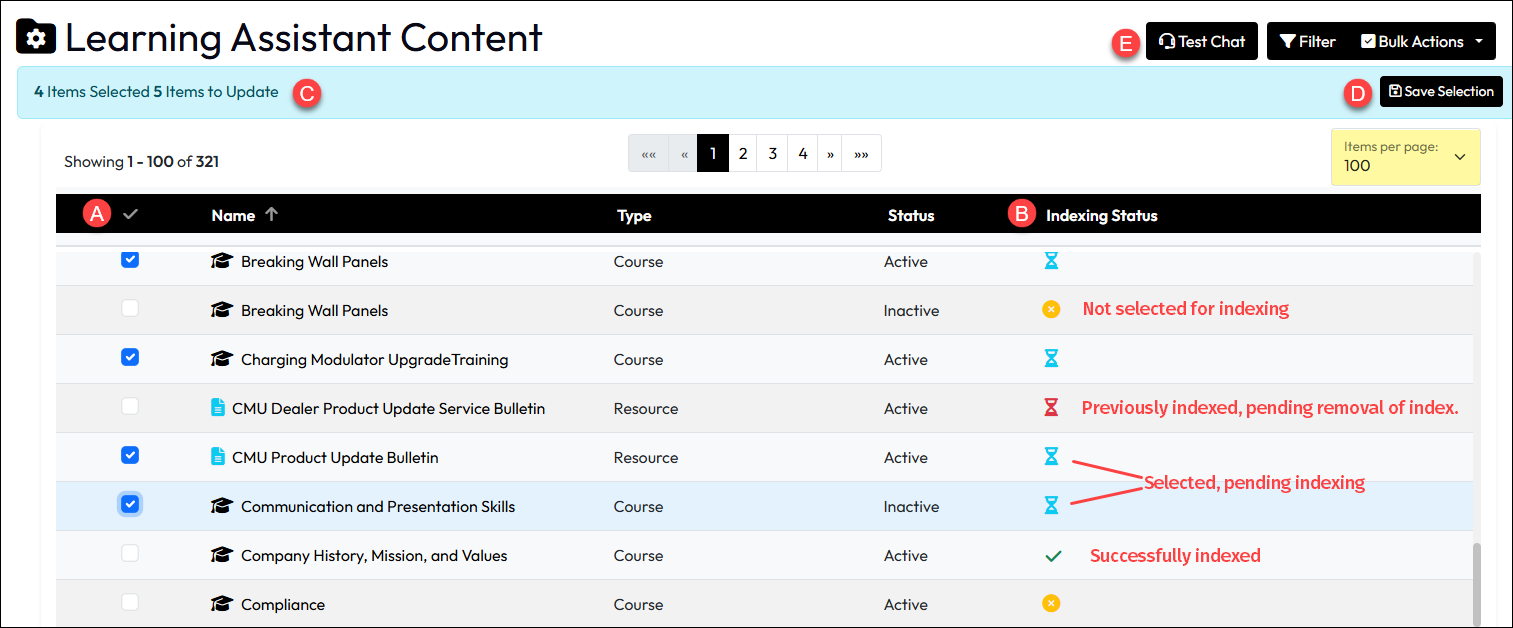 Indexing content means including it in the data that trains the chatbot to support people’s questions and helping it find the answers more quickly. To include or exclude content from the Learning Assistant’s knowledge base: