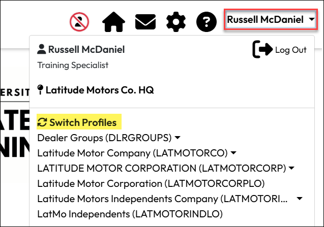 For users with profiles in multiple organizations, such as locations, divisions, or business units, it may be necessary in some situations to switch to a different profile to view or edit people, courses, and other information not visible when using the default profile.