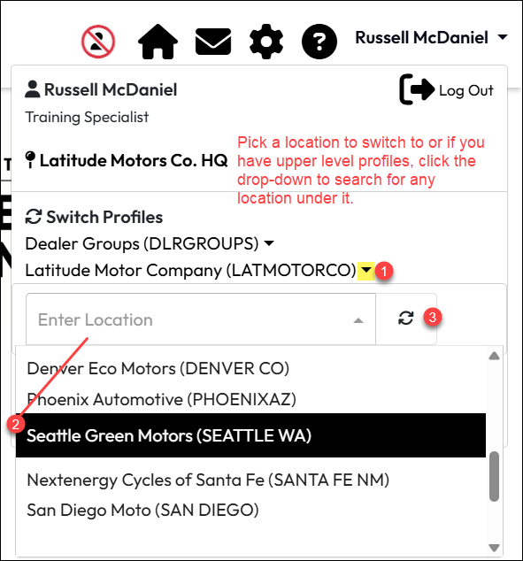 • Click into the Enter Location field and either use type-ahead search to narrow down the results or scroll through the list. Select the location (2) to which you want to switch.