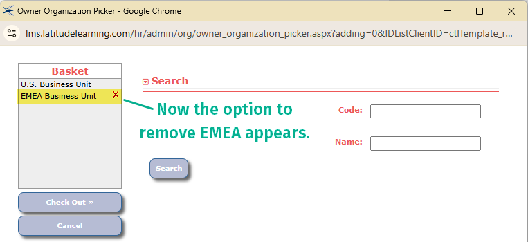 By switching to a profile in any location under the EMEA Business unit, you can return to the course organizations list and find the “X” to remove it from the list.