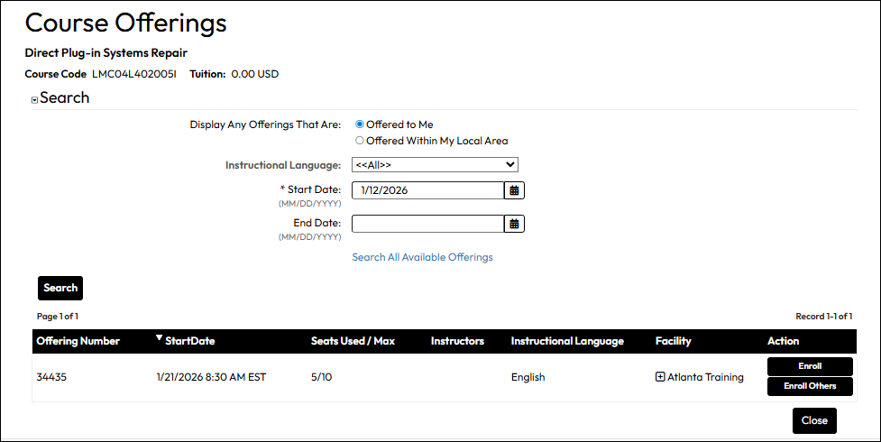 Classroom and Virtual Classroom courses cannot take direct enrollment. Enrolling yourself or others in an instructor-led course requires the existence of a scheduled offering for the course. How to find them? There are a number of places, in addition to the Catalog search, where offering lists are found.
