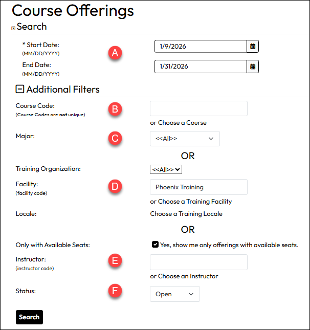 If the portal administrator has exposed the Course Offerings feature on the Navigation Menu, it offers an easy way to filter for Course Offerings you want to see using options like the course code, the facility, and number of open seats. The only required filters is Start Date.