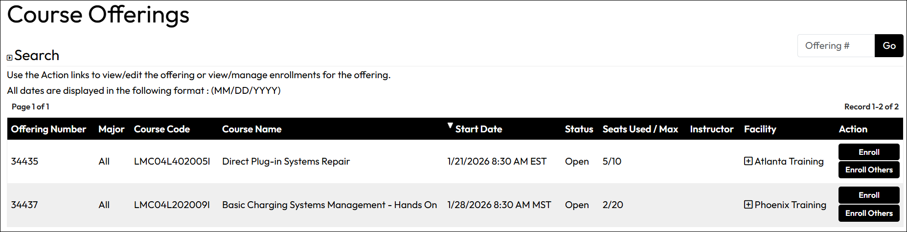 Classroom and Virtual Classroom courses cannot take direct enrollment. Enrolling yourself or others in an instructor-led course requires the existence of a scheduled offering for the course. How to find them? There are a number of places, in addition to the Catalog search, where offering lists are found.