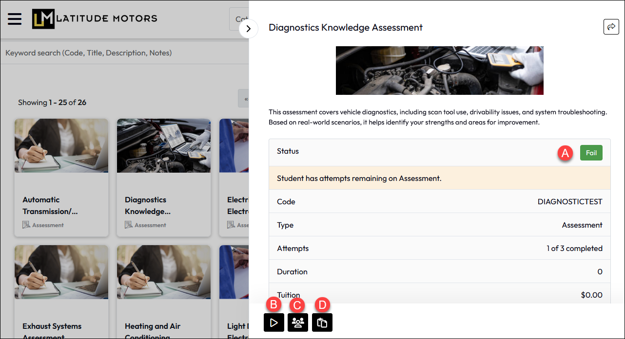 How you access Assessments will vary by portal based on the configurations made by your portal administrator. Some common places you will see them include Course Search, Courses to Complete, and My Learning.
